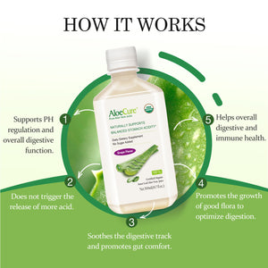 • Aloe vera helps naturally maintain balanced levels of stomach acidity by supporting balanced pH levels, but not enough to trigger the release of more acid.